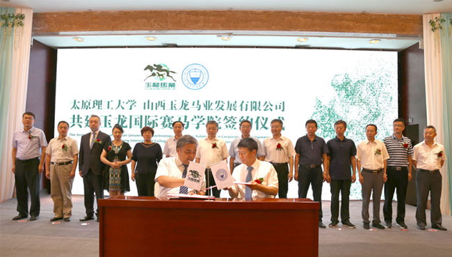 太原理工大學(xué)玉龍國際賽馬學(xué)院是太原理工大學(xué)與山西玉龍馬業(yè)發(fā)展有限公司,本著優(yōu)勢互補、強強聯(lián)合的原則共建的培養(yǎng)賽馬業(yè)和馬術(shù)界高端管理人才辦學(xué)機構(gòu)。2018年8月,雙方簽訂了共建“玉龍國際賽馬學(xué)院”合作協(xié)議,為中國馬業(yè)和教育領(lǐng)域,雙雙填補了國內(nèi)空白。2018年9月雙方在玉龍馬業(yè)舉辦了掛牌儀式。